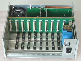 The device consists of a basic unit (Mainframe RMF22) with bus board and pluggable modules. Modules can be inserted from the front and the back. 11 slots are available, one per inch (25.4 mm). This is the smallest possible module width, larger modules are multiple times wider. With 3.15 inch (80 mm) module height and 3.7 inch (94 mm) front panel height, the RMF system is considerably more compact than similar 19” systems. Layout and equipment are EMC-compliant designed (conductive surface finishing, contact strips, shielding...).